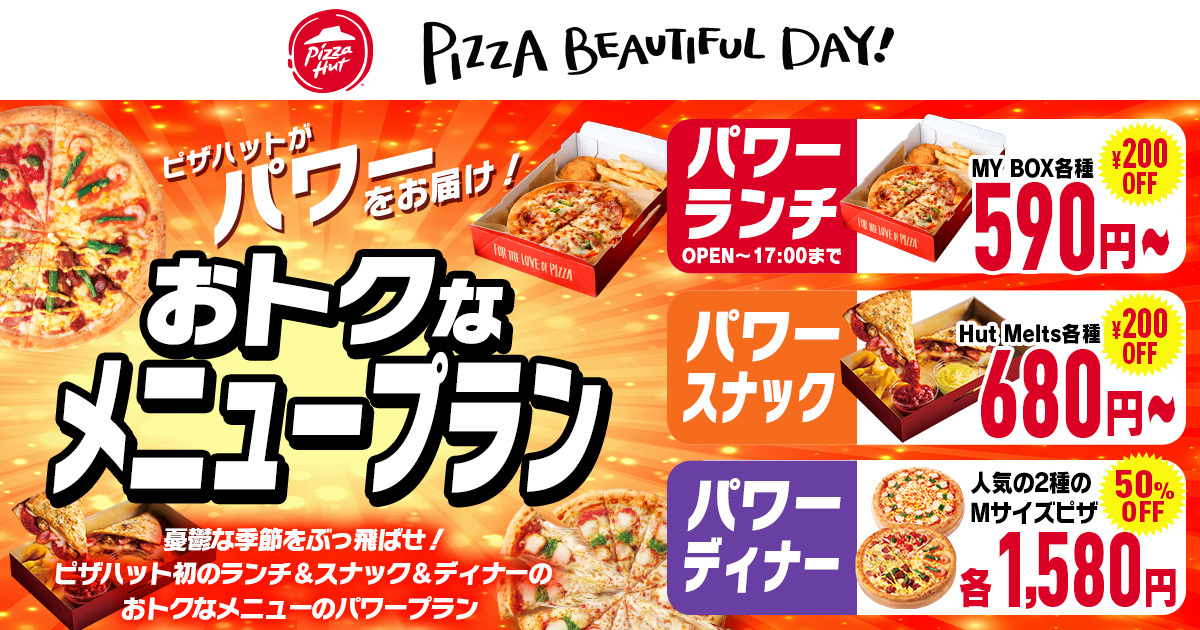 いつだっておいしいこと。おトクなこと。それが 想像以上であること。商品、サービスはもちろん、ウェブサイトやアプリなどお客様と私たちを結ぶすべてにおいてどんな時でもそうありたいとピザハットは思います。これはお客様との約束であり、自分たちとの約束。これからもお客様がワクワクできる「想像以上」の価値をお届けしていきます。ピザハットの本気にぜひご期待ください。