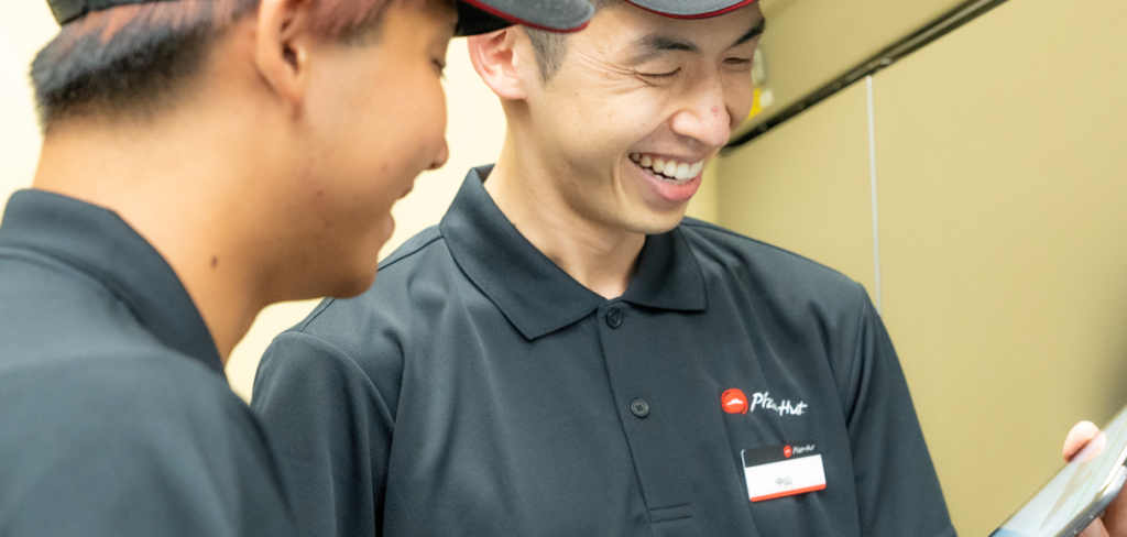 当社では、未経験の方や異業界の方でも安心して現場に入っていけるように、入社後約3ヶ月にわたって店長としてのスキルや知識を身に付ける「ピザハットアカデミー」という研修を行っています。ピザハットの中途入社は毎月1日と決まっているため、同時期に入社した中途入社同期と共に座学や実施研修を行います。講師も元店長のベテランが多く在籍しており、ユニークで充実した内容となっています。特に受講生からのコメントで際立つのは「同期との絆が生まれる」こと。学校さながらに同じ課題をこなしてきた同期にはいつの間にか絆が生まれ、研修が終わり現場配属されても気軽にLINEでやりとりするような関係性が生まれ、非常に受講生に人気です。