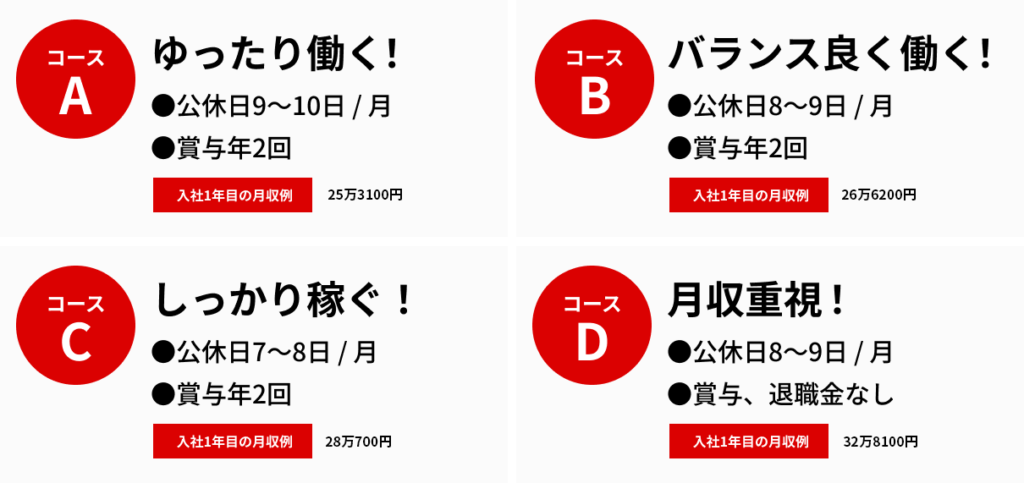 人の数だけ転職理由はさまざまです。例えば子どもとの時間を大切にしたい人や、20代でしっかり稼ぎたいと思っている人。はたまた、譲れない趣味がありその時間を最優先にしたい人。いろんな人が「ピザハットで働きたい」と思ったとき、「働き方」を理由に諦めないでほしいので、当社では「公休日」「賞与・退職金」を組み合わせて4パターンの働き方をご用意しております。例えば、プライベートが最優先な方には公休日を9~10日/月・賞与年2回として想定月収は24万3600円(初年度)のパターンや、収入をとにかく増やしたいという方には、公休日を7~8日/月・賞与年2回・月収として想定月収は26万9600円(初年度)のパターンなどをご用意しています。